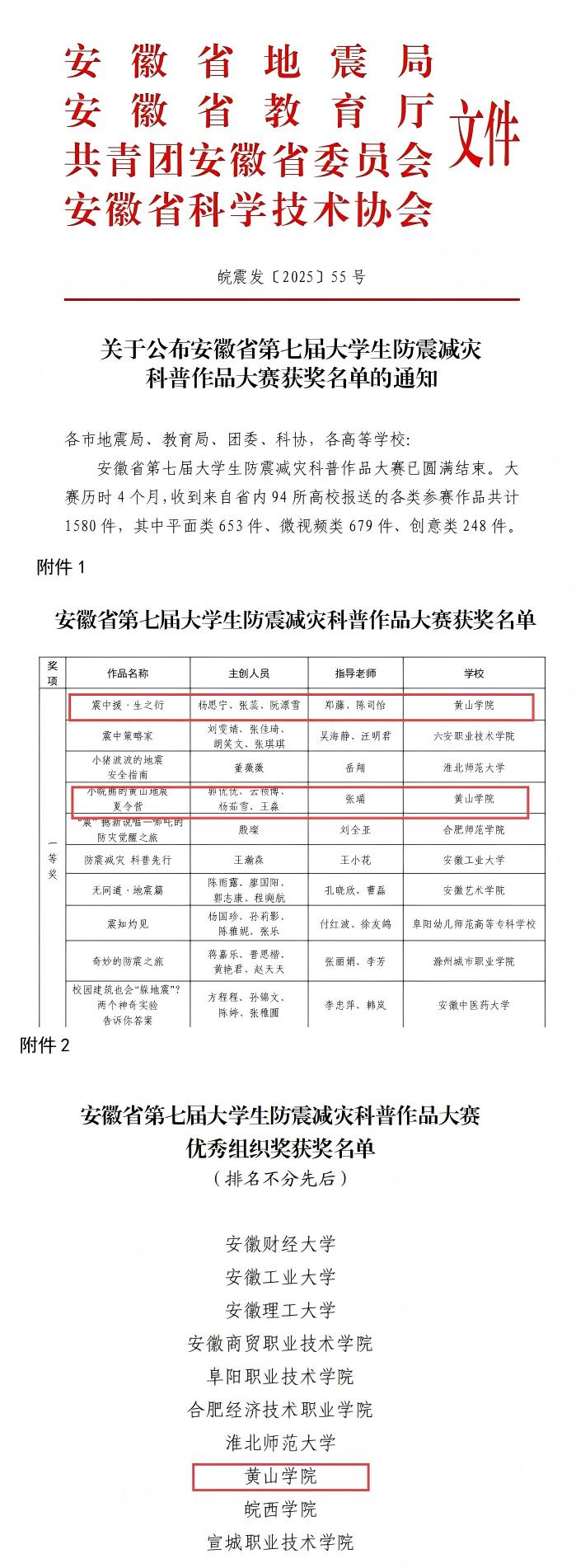 近日,安徽省第七届大学生防震减灾科普作品大赛获奖结果揭晓,我校学子在此次赛事中斩获佳绩:由杨思宁、张蕊、阮漂雪等同学创作,郑藤、陈司怡老师指导的作品《震中援・生之衍》,以及郭优优、云祯博、杨茹雪、王淼等同学创作,张瑞老师指导的作品《小皖熊的黄山地震夏令营》,双双荣获一等奖;学校荣获优秀组织奖。