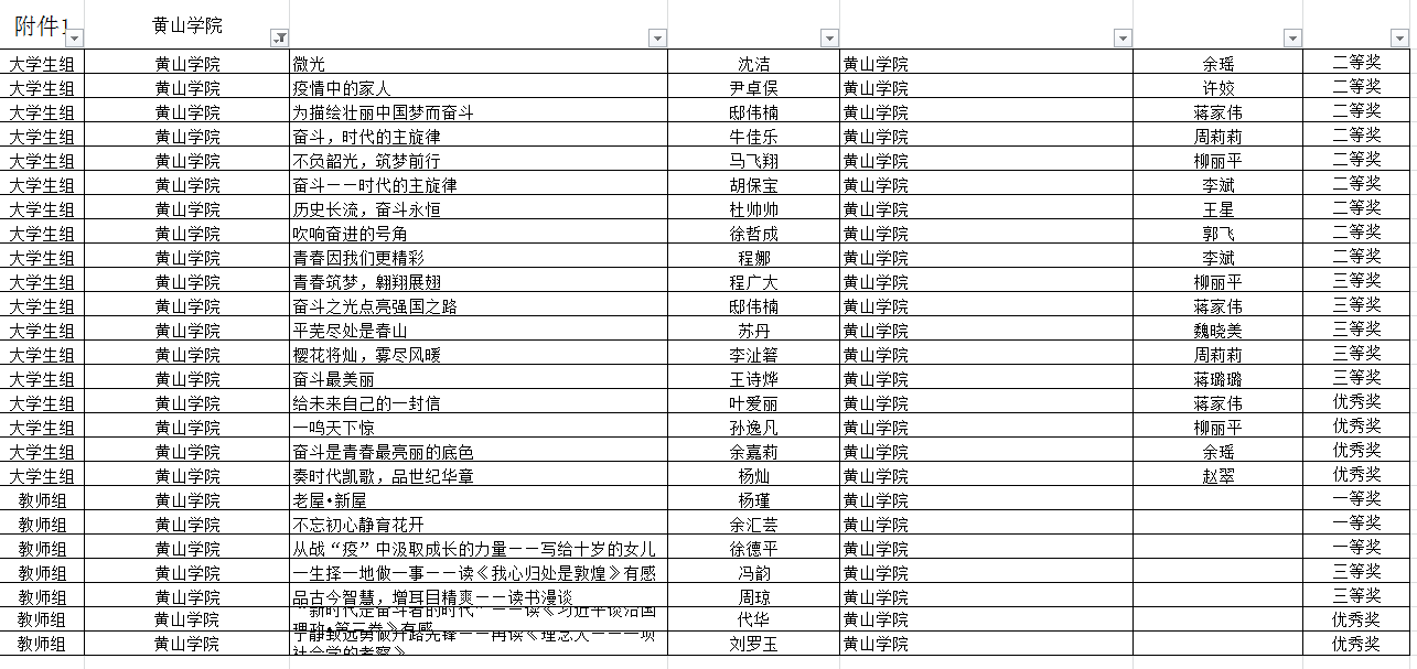 在安徽省第四届校园读书创作活动中,我校共有25名师生获奖。教师组7人获奖,其中,杨瑾、余汇芸、徐德平等3人获一等奖,冯韵、周琼等2人获三等奖,2人获优秀奖;学生组18人获奖,其中9人获二等奖,5人获三等奖,4人获优秀奖。在师生素养提升成果展演节目中,由文化与传播学院教师方婷婷指导的朗诵作品《驼峰之魂》,方婷婷、罗飞雁老师指导的小品《我和祖国有个约定》 2件作品获得二等奖。