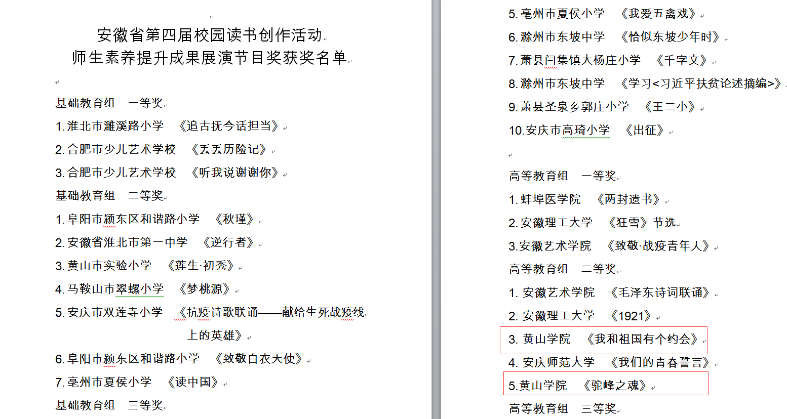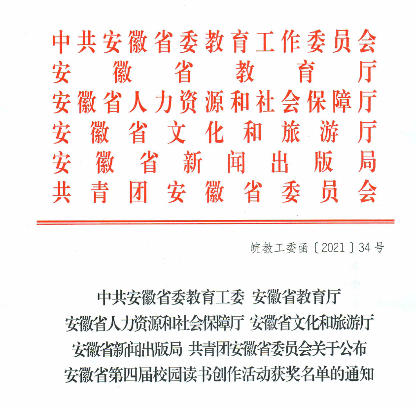近日,安徽省委教育工委、安徽省教育厅、安徽省人力资源和社会保障厅、安徽省文化和旅游厅、安徽省新闻出版局、共青团安徽省委员会联合发文公布了安徽省第四届校园读书创作活动获奖名单(皖教工委函〔2021〕34号),我校在读书创作活动和师生素养成果展演两个项目中获得佳绩。