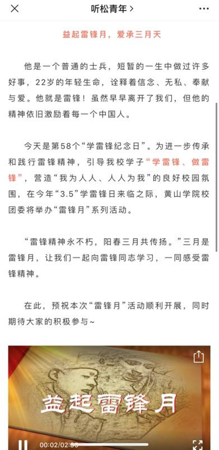 为深入贯彻习近平新时代中国特色社会主义思想,进一步弘扬和培育新时代雷锋精神,倡导广大青年学生传承雷锋精神,积极参与志愿服务活动,3月5日起,校团委在全校范围内开展以“益起雷锋月,爱承三月天”为主题的学雷锋志愿服务活动。活动启动仪式通过观看线上视频的方式进行。