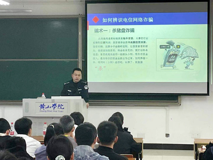 为进一步普及防诈骗知识,提高学生安全防范意识,3月24日下午,保卫处邀请屯溪公安分局阳湖派出所民警姚望在文渊楼1204教室作题为“安全防骗知识进校园”专题宣讲。全校2020级班级安全委员和学生治安队队员参加了活动。