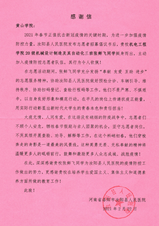 近日,我校收到一封来自河南省洛阳市汝阳县人民医院的感谢信。信中对我校机电工程学院2020级机械设计制造及其自动化3班张鲜飞同学,在疫情期间积极参与疫情防控工作给与了高度评价,表示了诚挚的感谢。