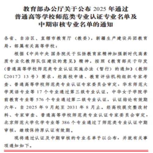 近日,教育部办公厅正式发布了《关于公布2025年通过普通高等学校师范类专业认证名单及中期审核专业名单的通知》。我校学前教育专业成功通过认证,认证结论有效期为六年。