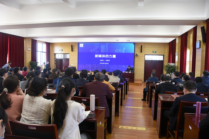 马宝军从“60秒瞰新疆机采棉”和“总书记,您好!我是卓嘎”两个新媒体短视频导入,结合多年媒体行业的从业经历,运用丰富的案例,从新媒体的转型、如何运用新媒体、拓展新媒体的功能等几方面阐述了新媒体的力量。他指出,新媒体的力量深刻改变了原有的社会思维习惯、传播方式和交往模式。新媒体更注重“时度效”,讲究“短平快”,用得好,是有力武器。习近平总书记说,读者在哪里,受众在哪里,宣传报道的触角就要伸向哪里,宣传思想工作的着力点和落脚点就要放在哪里。高校要热情拥抱新媒体,发挥新媒体在思想政治教育、突发事件舆论引导等方面的积极作用,培养德智体美劳全面发展的社会主义建设者和接班人。