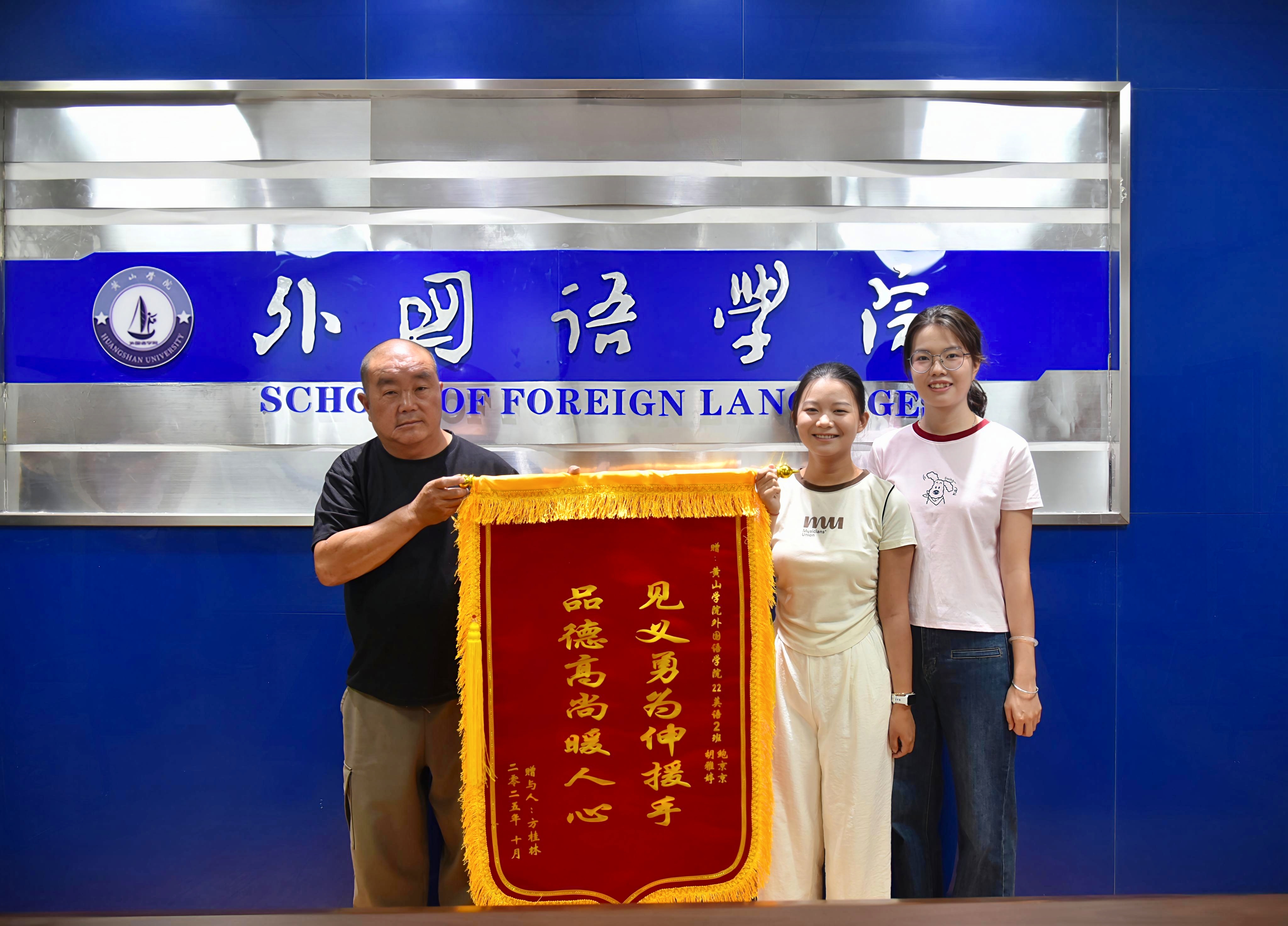 10月10日上午10点,一面印着“见义勇为伸援手,品德高尚暖人心”的鲜红锦旗,悄然送到了黄山学院外国语学院22级英语2班鲍京京、胡雅婷同学手中。送旗人正是此前被救助的方先生,他辗转阳湖派出所、学校安全管理处等多地,终于找到在雨夜里为他伸出援手的两位女大学生。