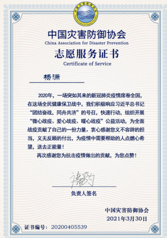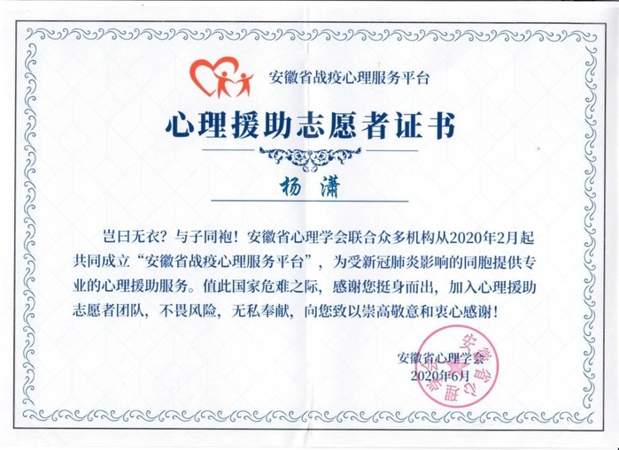 近日,中国灾害防御协会向我校大学生心理健康教育中心专职心理咨询师颁发志愿者服务证书,感谢疫情期间我校选派专、兼职心理咨询师参与到全国范围内“微心战役”心理危机干预与援助工作中。