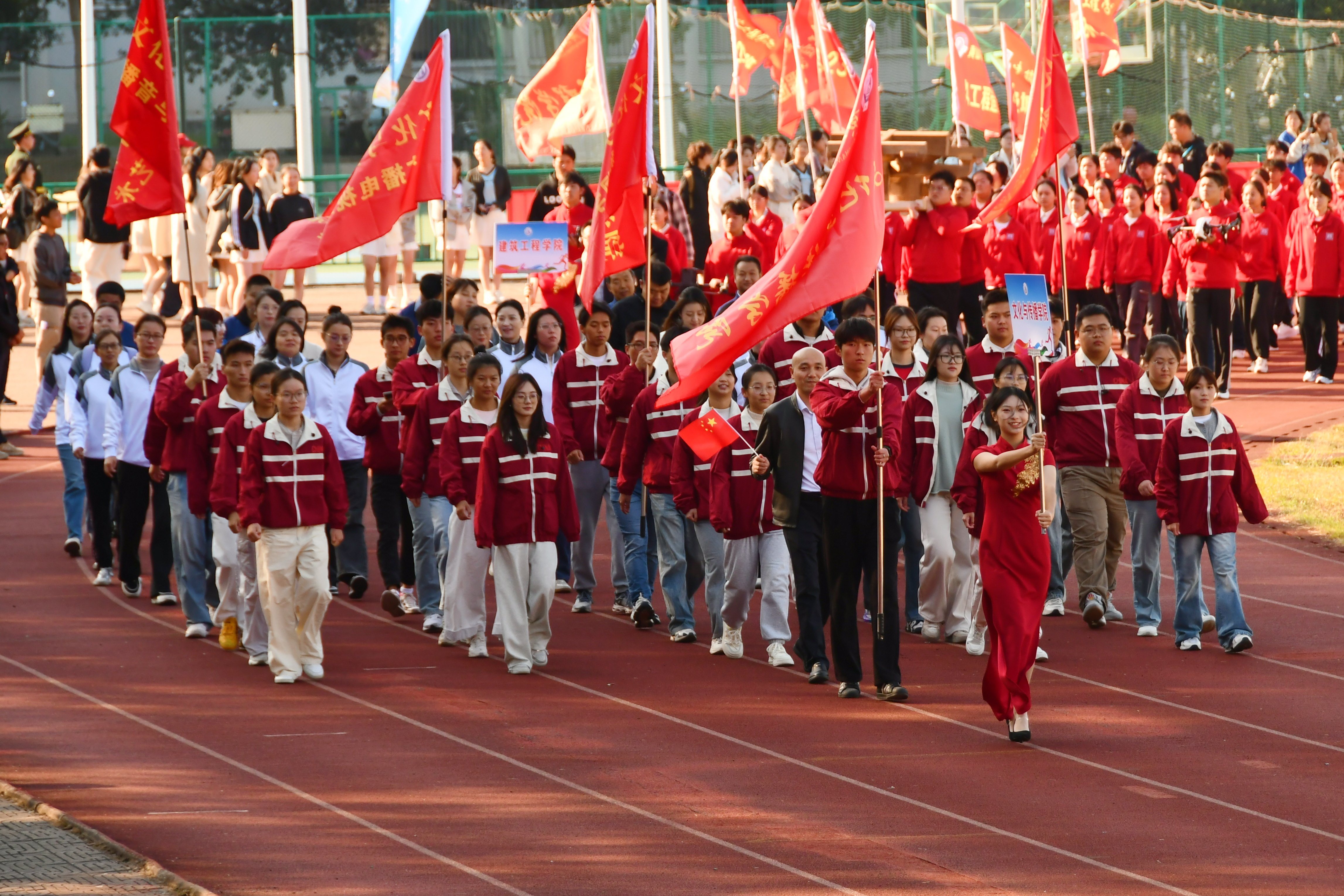 文艺展演环节亮点纷呈,为开幕式增添了浓厚氛围。教育科学学院的舞蹈《我心中的红》,以灵动舞姿和炽热情感,诠释了红色记忆、庄严敬仰与青春信念的深刻内涵。文化与传播学院的现代舞《逐光行》,以舞蹈为载体,书写青春理想,传递对光的追寻与青年同行的姿态。旅游学院的礼仪表演《茶韵礼心》登场,表演者通过温杯烫盏、凤凰三点头等茶艺动作,搭配站、立、躬、奉茶等规范姿态,展现了“不学礼,无以立” 的文化传承与优雅风范。最后,全校14个二级学院共计560名大一新生演示的军体拳整齐划一、刚劲有力,转身踢腿行云流水,出拳格挡迅猛稳健,尽显专业素养与战斗精神,为开幕式增添了昂扬气势。