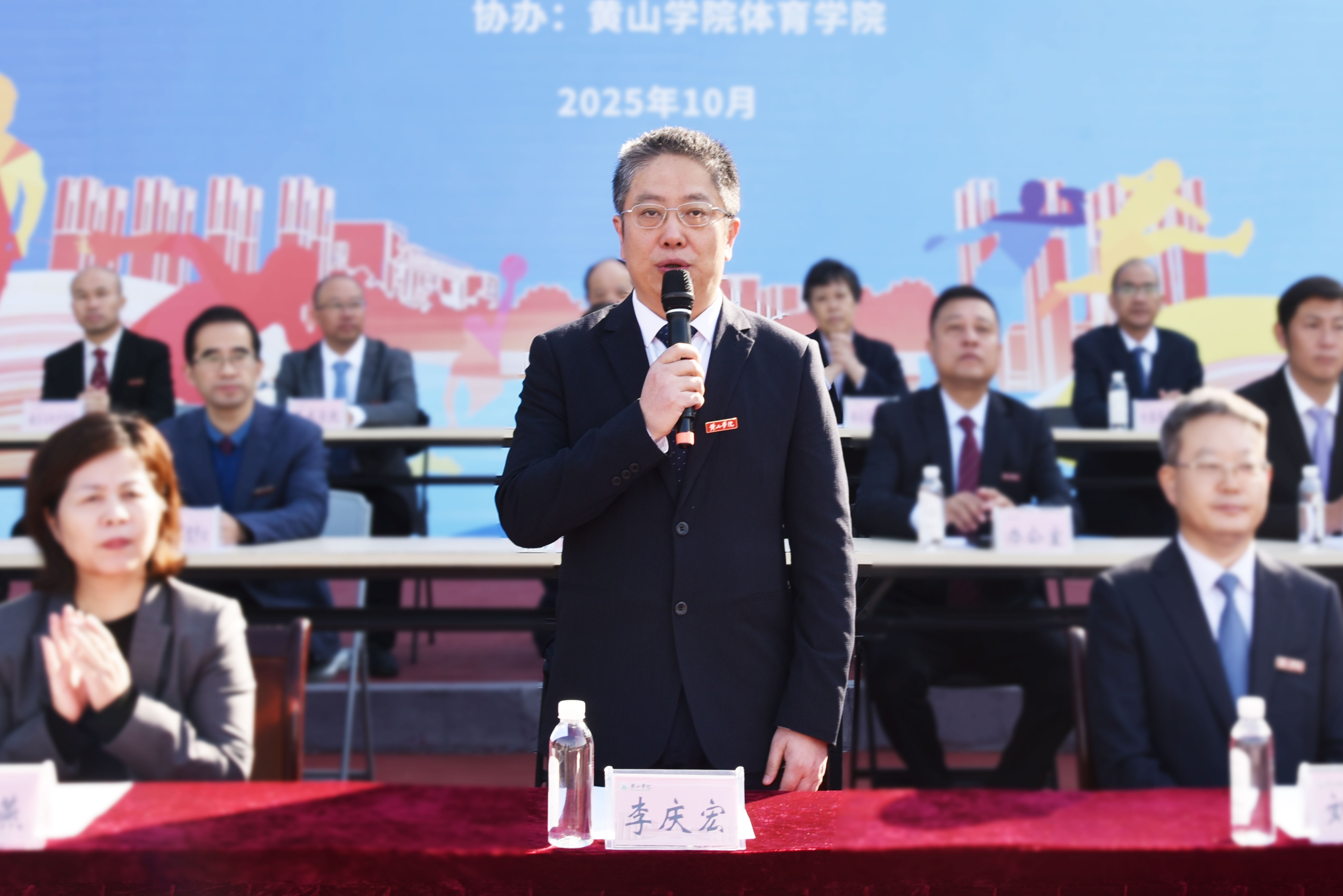 校党委委员、副院长方辉平致开幕辞。他希望全体运动员发扬“更高、更快、更强、更团结”的奥林匹克精神,恪守公平竞争原则,尊重规则、尊重裁判、尊重对手;希望全体裁判员与工作人员忠于职守、秉公执裁,维护秩序、保障公平;希望各单位带队老师、辅导员及志愿者同学们通力协作,悉心保障,传递温暖;希望全体同学文明观赛,友爱助威,展现黄山学院学子良好的精神风貌,共同营造热烈、和谐、安全、有序的赛场氛围。他呼吁广大师生将赛场拼搏精神融入日常,让健康理念深入人心,共同书写学校高质量发展新篇章,最后预祝运动员取得佳绩、运动会圆满成功。