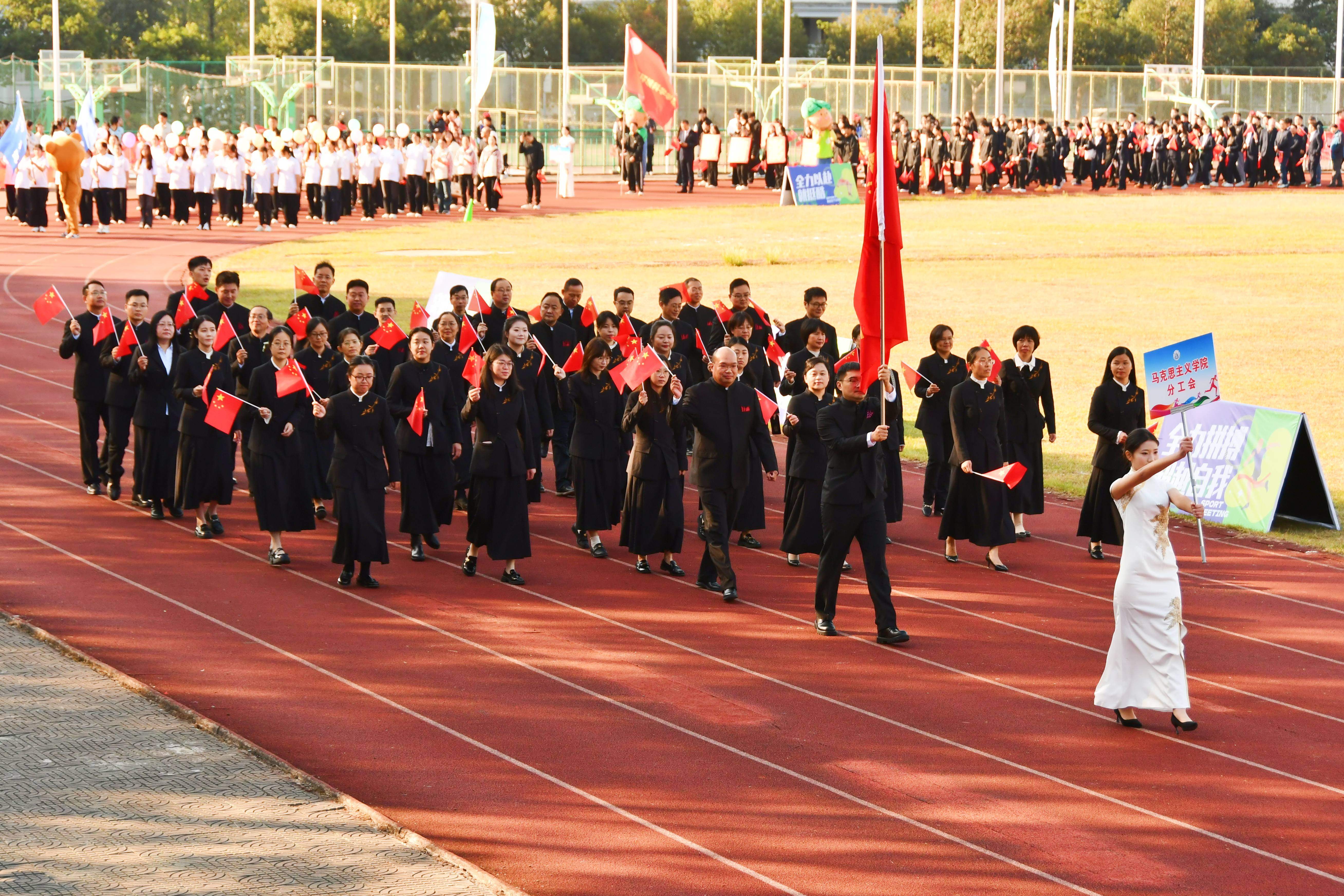 上午8时20分,《运动员进行曲》雄壮奏响,开幕式入场环节正式开启。国旗、校旗、会旗及标语牌方阵率先经过主席台,拉开了方阵展示的序幕。在彩旗队的引领下,17支由各学院师生、部门教职工组成的运动员方阵,以及体育学院师生组成的裁判员方阵依次亮相。各方阵精神抖擞、迈着整齐的步伐,喊着嘹亮的口号,昂扬走过主席台。方阵展示中,既有凸显专业特色的创意编排,又有融合传统文化与时代元素的精彩演绎,充分展现了黄山学院学子的青春风采与团队凝聚力。