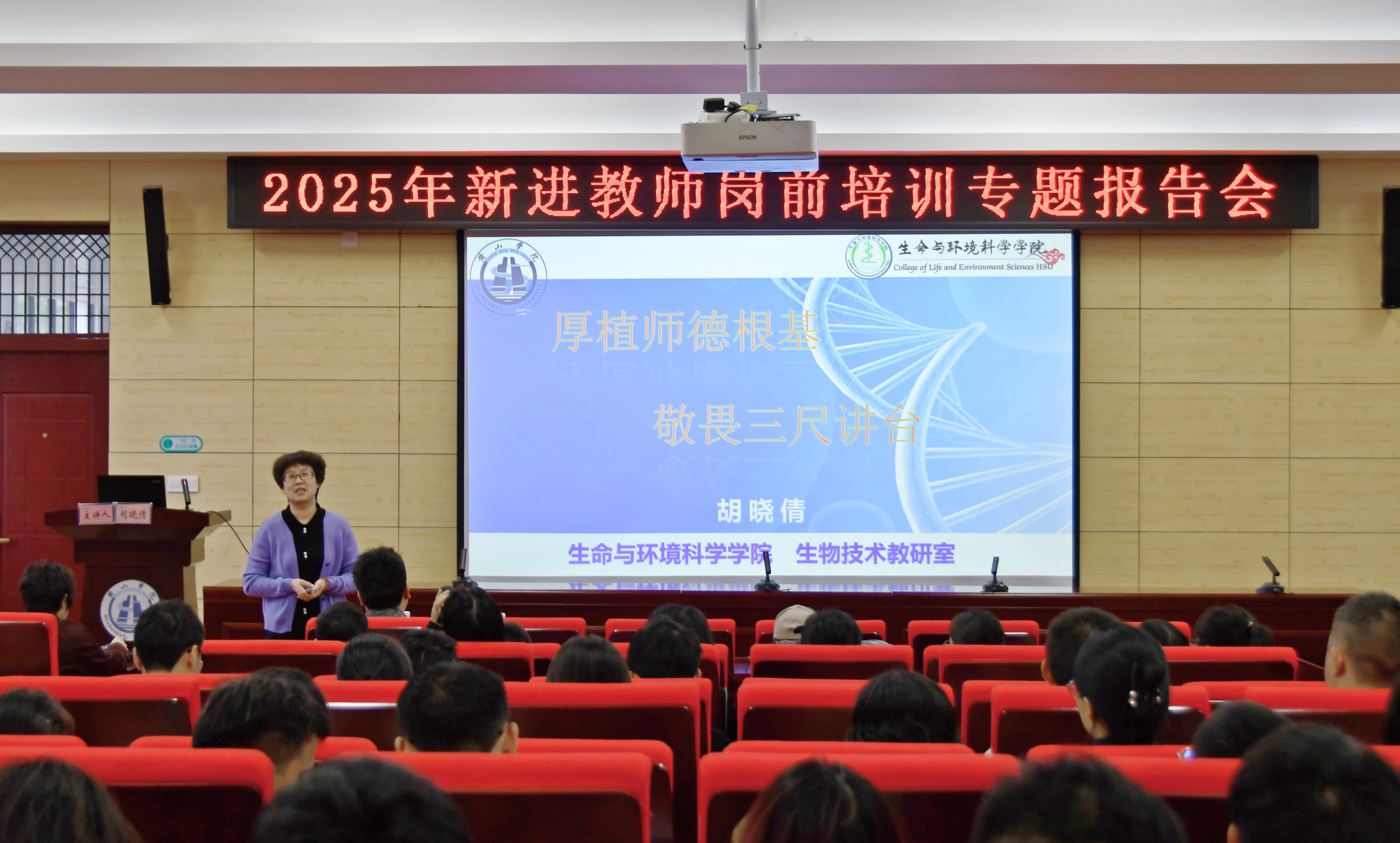 开班典礼后,生命与环境科学学院胡晓倩教授与马克思主义学院汪靓老师分别就师德师风及习近平总书记关于教育的重要论述为大家作了专题讲座。
