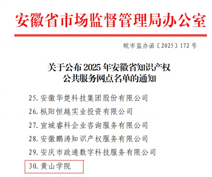 近日,我校荣登安徽省市场监督管理局发布的“2025年安徽省知识产权公共服务网点”名单,成为全省4家省属高校类服务网点之一,标志着我校立体化、多层次的知识产权服务体系初步形成。
