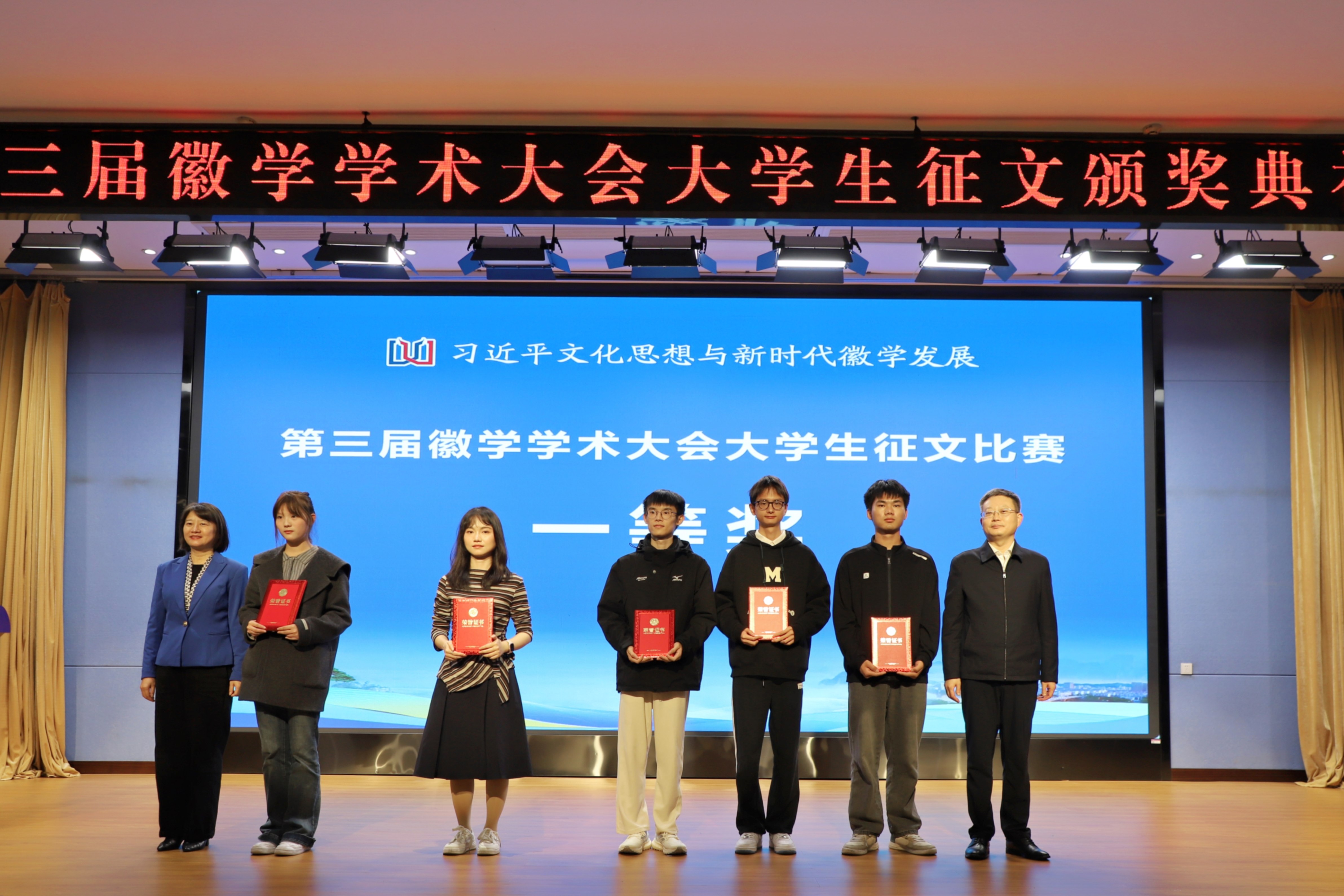 典礼上,与会领导嘉宾为第三届徽学学术大会大学生征文比赛获奖代表颁奖。复旦大学的黄雨晨、黄山学院的张丰瑞、安徽大学的廖锦清、安徽师范大学的许雪昕代表获奖者发言。