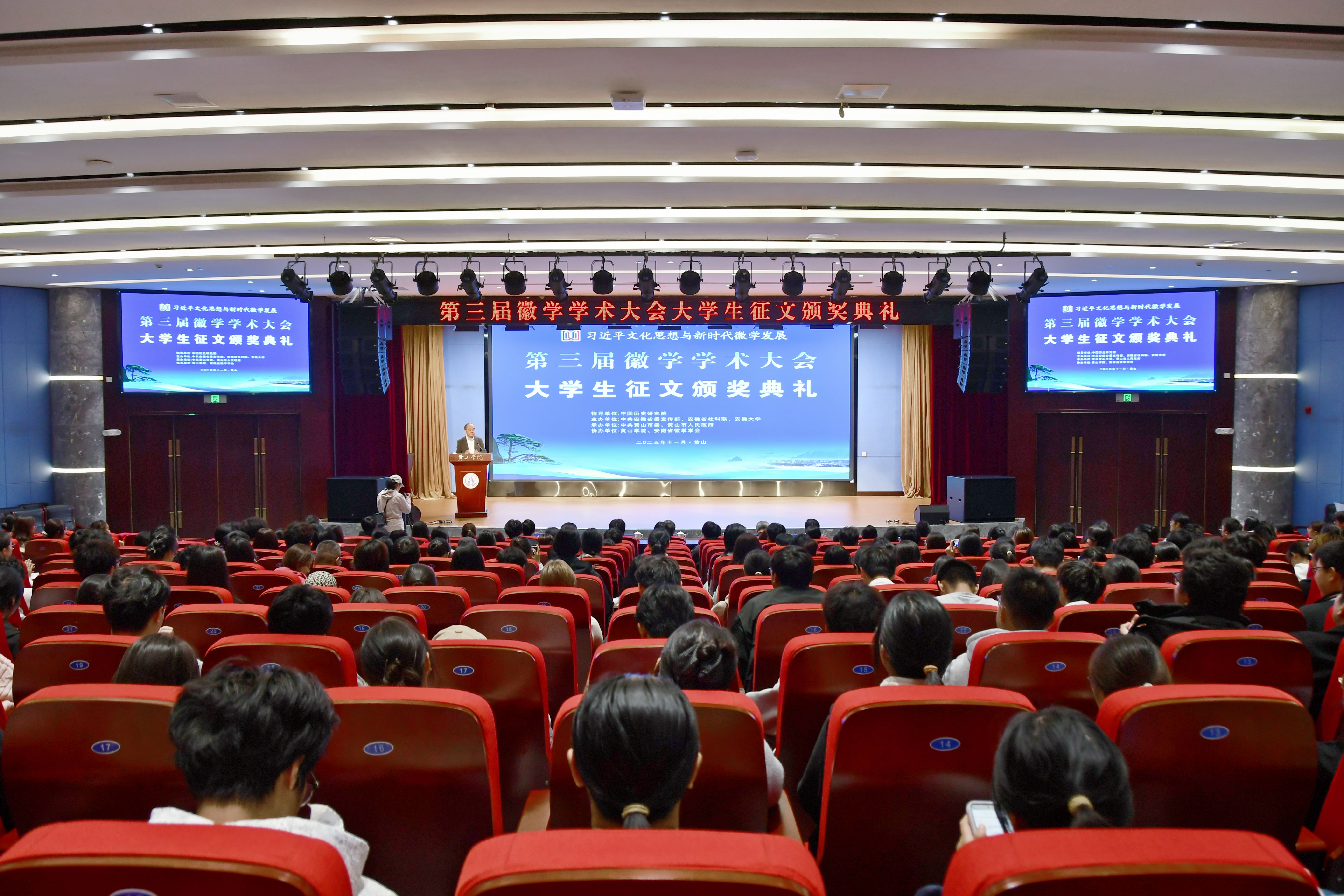 11月8日上午,第三届徽学学术大会“我眼中的徽州与徽州文化”大学生征文颁奖典礼在我校文博楼二楼报告厅举行。校党委副书记刘力,党委委员、副院长张小明,黄山市人民政府副市长江卓琪,省社科联秘书长韩修良,黄山市社科联党组书记、主席汪明洁,安徽大学徽学研究中心总支书记张鑫出席典礼。获奖学生代表、黄山学院师生代表参加典礼。典礼由张小明主持。