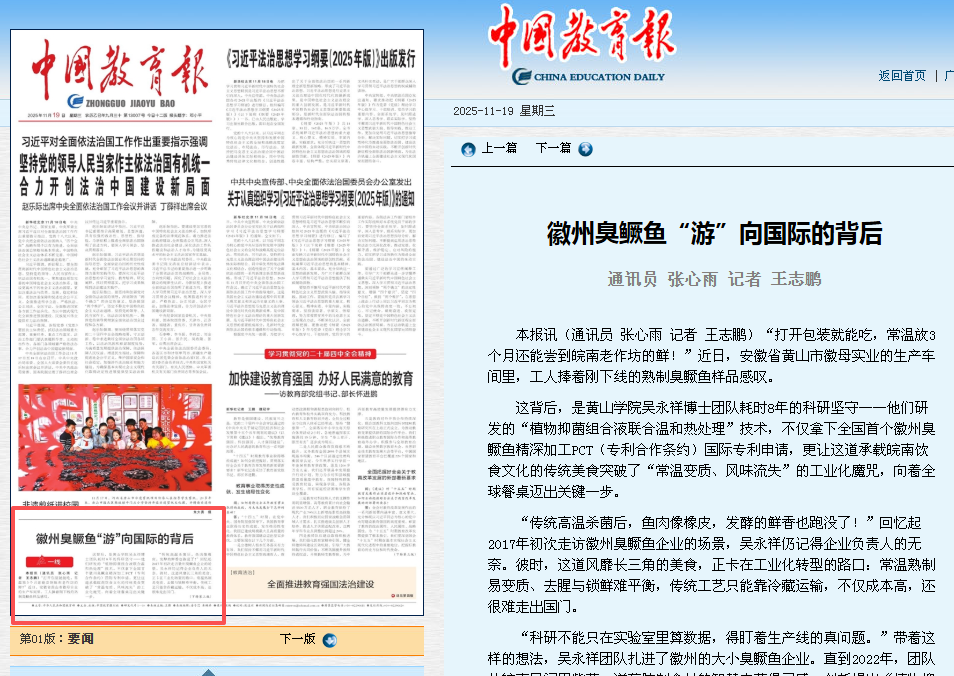 11月19日,《中国教育报》头版以《徽州臭鳜鱼“游”向国际的背后》为题,用显著篇幅报道我校吴永祥博士团队历时8年的科研攻坚成果。团队创新研发“植物抑菌组合液联合温和热处理”技术,成功破解徽州臭鳜鱼工业化转型核心难题,拿下全国首个该品类精深加工PCT国际专利申请,让这道承载皖南饮食文化的非遗美食,迈出走向全球餐桌的关键一步,生动彰显了我校“产学研深度融合、精准服务地方发展”的办学特色。