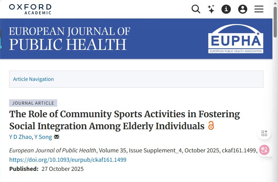 会议期间,宋莹与世界卫生组织(WHO)、欧盟委员会、欧洲公共卫生协会(EUPHA)等国际组织及多国专家进行深入交流,她的论文《The Role of Community Sports Activities in Fostering Social Integration Among Elderly Individuals》(社区体育活动在促进老年人社交融合中的作用)被牛津大学出版社旗下的JCR 一区期刊《European Journal of Public Health》(《欧洲公共卫生期刊》)录用,并在大会期间进行学术海报展示。