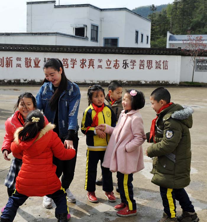 课间休息时间到了,孩子们像小鸟一样围在支教老师身边。“一下课,孩子们就拉着我的手不放,连喝口水的功夫都没有。”支教学生李亚笑着说。