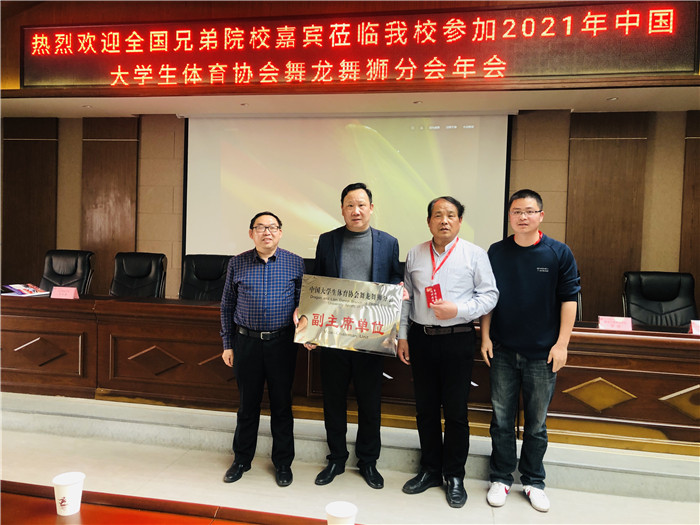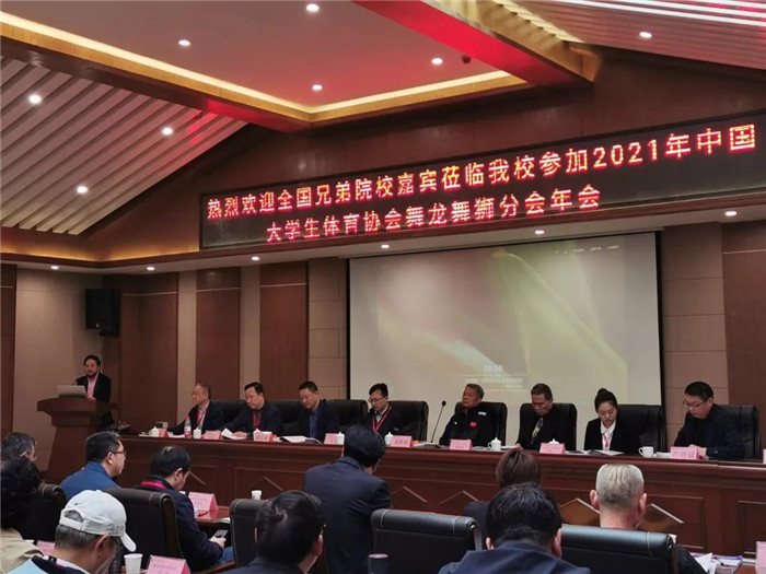 4月16至17日,2021年中国大学生体育协会舞龙舞狮分会年会在四川文化艺术学院召开。来自全国120余所中国大学生体育协会舞龙舞狮分会学校代表、传承中华优秀传统文化有关学校代表共同参加了会议,中国大学生体育协会副主席、舞龙舞狮分会主席陈治亚,中国大学生体育协会主任郝俊等出席开幕式。体育协会舞龙舞狮分会副主席、我校副校长胡善风率队参加了本次会议。