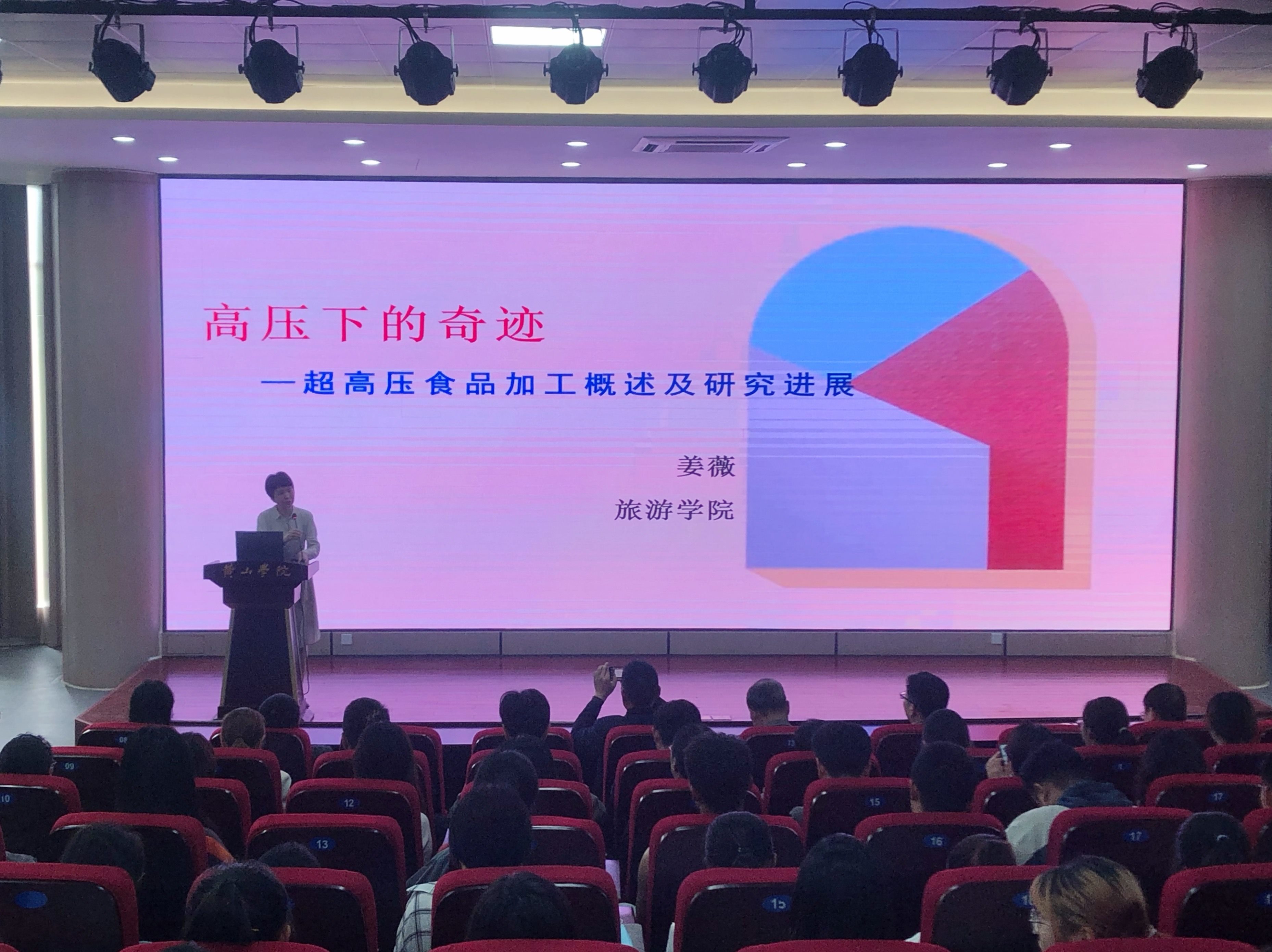 4月21日下午,黄山学院“行知讲坛”在文端楼二楼报告厅举行。旅游学院副教授姜薇博士应邀作题为《高压下的奇迹——超高压食品加工概述及研究进展》的报告。报告会由旅游学院院长金声琅教授主持,200余名师生到场聆听。