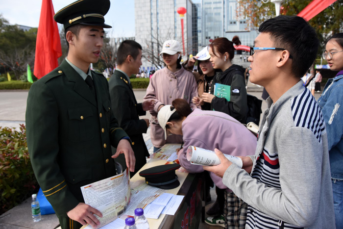 学校充分发挥退伍在校学生的优秀品质和优良作风,专门成立大学生征兵宣讲团,在横江和率水校区分别举办征兵宣传专题报告会,退伍在校学生代表分别从部队待遇、专业训练、业务学习、入伍收获等方面讲述军旅生涯的心路历程,分享了他们由一名在校大学生成长为一名军人的蜕变历程,从刚入伍时的青涩转变为部队骨干的成长感悟;聘请12名退伍在校学生担任征兵义务宣讲员,在校内设置征兵宣传咨询台,利用周末和下课等人流密集的时间段面向学生宣讲征兵政策、服役待遇、军营成长经历等,及时做好意向学生登记工作;以2021届毕业生“校园双选会”等重要活动为契机,向前来求职的毕业班学生提供入伍政策咨询服务,解疑释惑,增强认知认同。