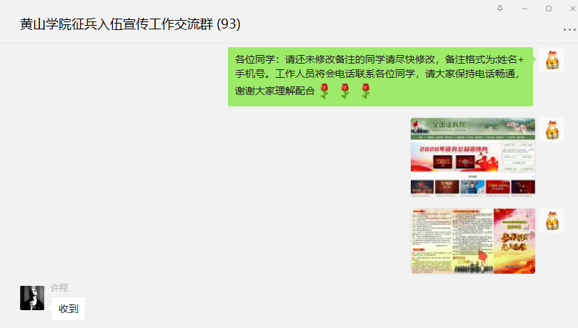 为便于与入伍意向学生及时沟通交流,校征兵工作站建立黄山学院征兵微信交流群,把意向学生聚拢起来。安排专人维护交流群,及时推送最新国家、省、市入伍优待政策,围绕意向学生自身关心和关注的问题在线进行互动和交流,实时答疑解惑。同时,加强交流群的管理和舆论引导,守住安全底线,确保信息发布准确无误。在往年征兵工作经验的基础上,校征兵工作站结合意向学生登记情况,建立跟踪服务台账,组织征兵一线工作人员和班级辅导员通过“点对点”“一对一”等方式了解预征集学生基本情况,动态掌握预征对象学生的思想状况和身体状况,积极做好网上报名、上站体检、役前集训、定兵入伍、学费补代偿等服务工作,实现报名应征“一站式”精准服务,参军入伍“一条龙”办理。