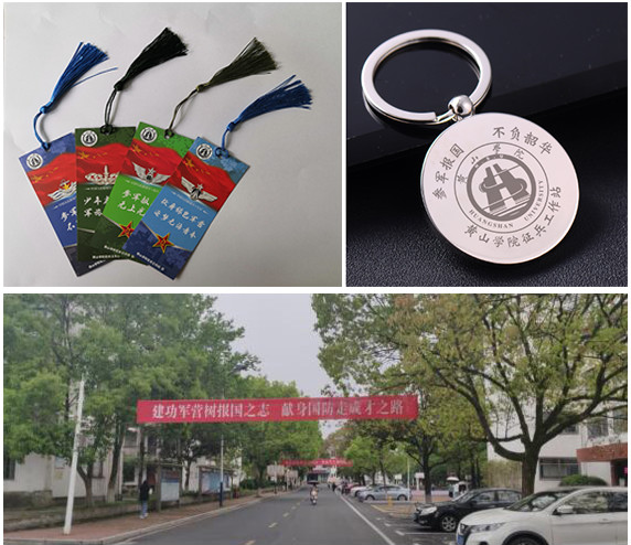 学校充分整合利用退伍在校学生资源,以他们从军经历和感悟为素材,拍摄制作黄山学院征兵工作宣传片---《青春热血赴山河》,在学校大屏幕上进行滚动播放,并在学工在线和易班等新媒体上同步推送宣传,用身边人身边事激发我校学子携笔从戎、参军报国的热情。同时,利用校园橱窗开设入伍学生光荣榜、退伍学生风采展,制作“走心”小物件、征兵宣传桁架,悬挂宣传横幅、发放《黄山学院2021年征兵宣传单》等,全方位地做好征兵宣传。今年,校征兵工作站还专门定制参军报国为题材的“书签”和征兵宣传“钥匙扣”,印制“硬骨雄风今犹在,披坚执锐驰新程”等宣传标语,全面展现了陆、海、空、火箭军等兵种部队的铁血风采,并通过征兵咨询台、报告会现场进行随机发放征兵宣传教育文创物件,在学生当中引起了热烈反响,获得了同学们纷纷点赞。