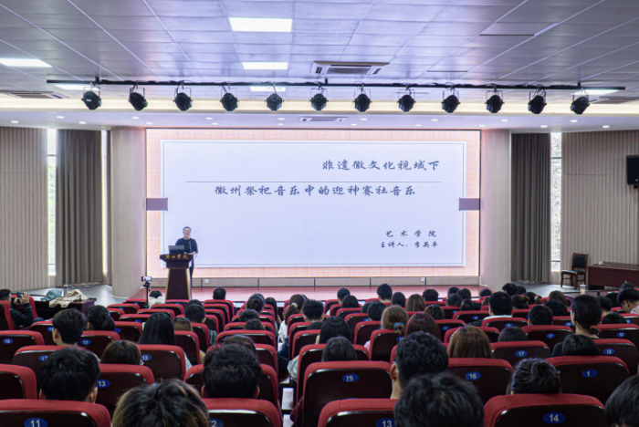 4月28日下午,行知讲坛第一百二十八讲在文端楼二楼报告厅举行。艺术学院李英卓老师作题为《徽州祭祀音乐中的迎神赛社音乐》的主题报告,报告会由艺术学院院长路善全主持,近300名师生到场参加报告会。