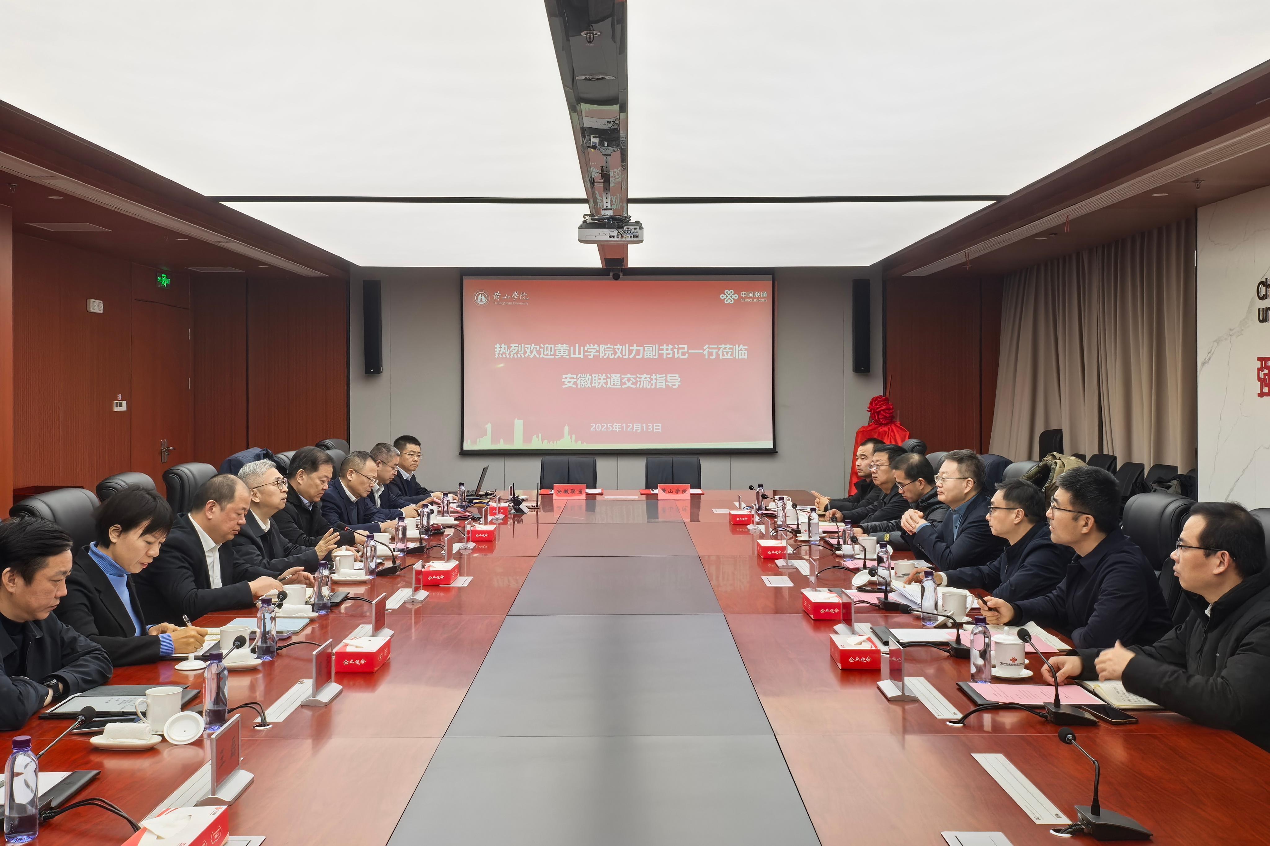 12月13日上午,我校与中国联合网络通信有限公司安徽省分公司战略合作协议签约仪式在中国联合网络通信有限公司安徽省分公司举行。我校党委副书记刘力,中国联合网络通信有限公司安徽省分公司党委书记、总经理韩冰,党委委员、副总经理刘鸿涛,黄山分公司党委书记、总经理刘诗丰出席签约仪式。