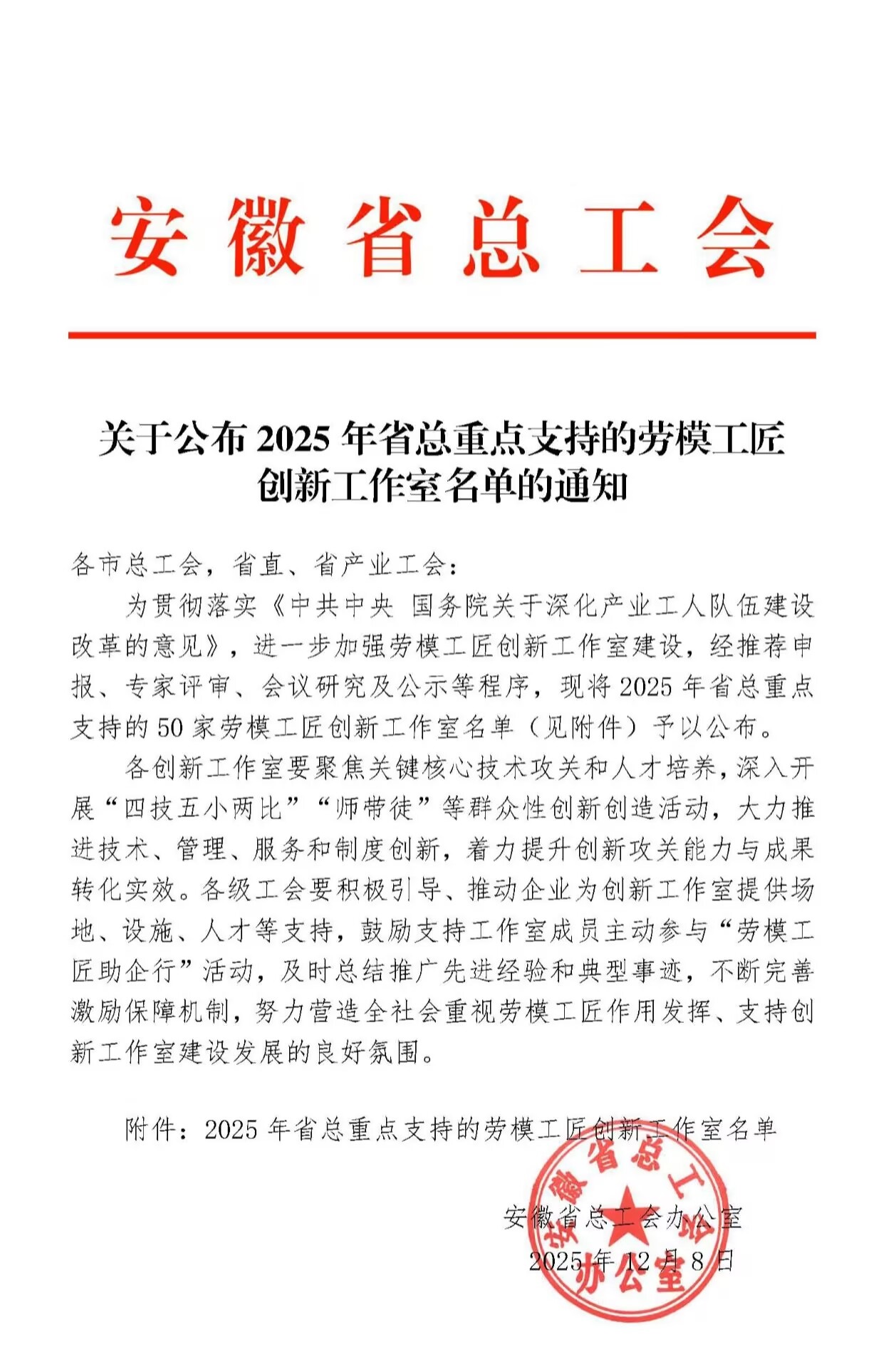近日,安徽省总工会发布《关于公布2025年省重点支持的劳模工匠创新工作室名单的通知》,我校赵昌恒劳模创新工作室入选2025年省重点支持的劳模工匠创新工作室名单。