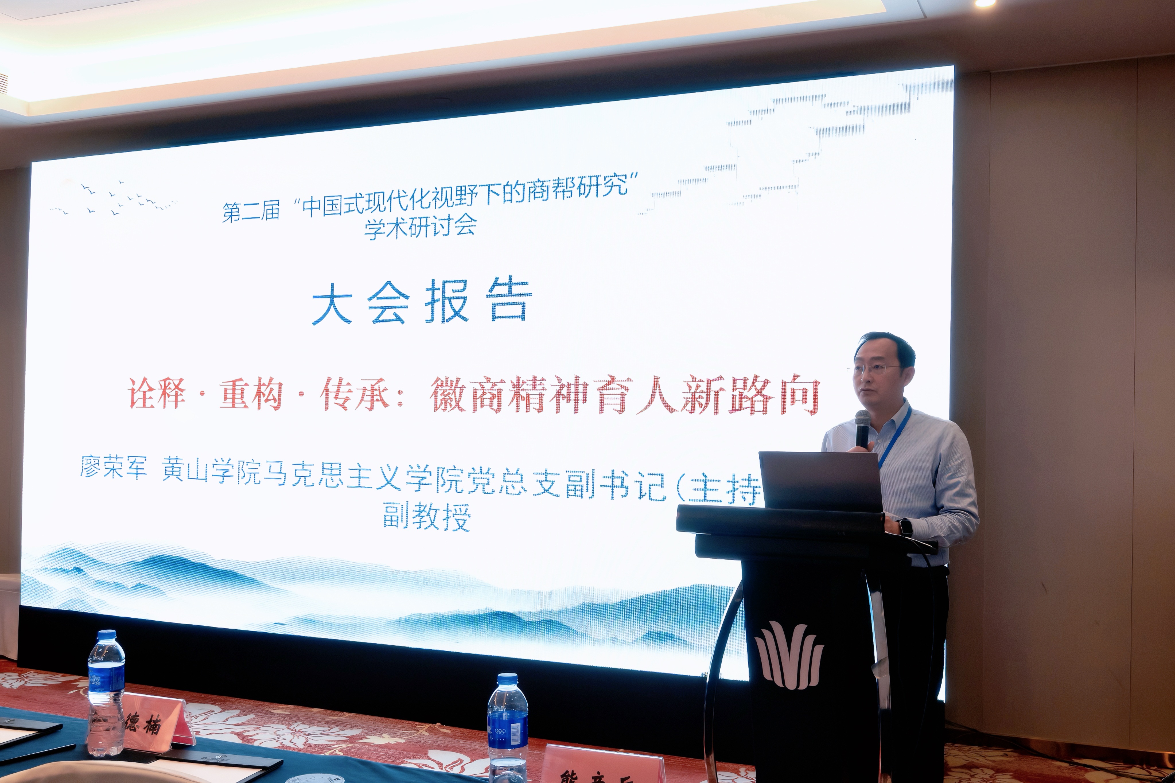 本次会议以“传统商帮文化精神及其创造性转化与创新性发展”为主题,会议的学术研讨环节采取主题报告和大会报告的形式进行。在大会报告环节,我校参会教师代表廖荣军、吴云峰、郭宏斌、刘芳正等分别围绕徽商精神育人新路向、民国时期上海徽州茶商营商环境等问题作专题学术报告。