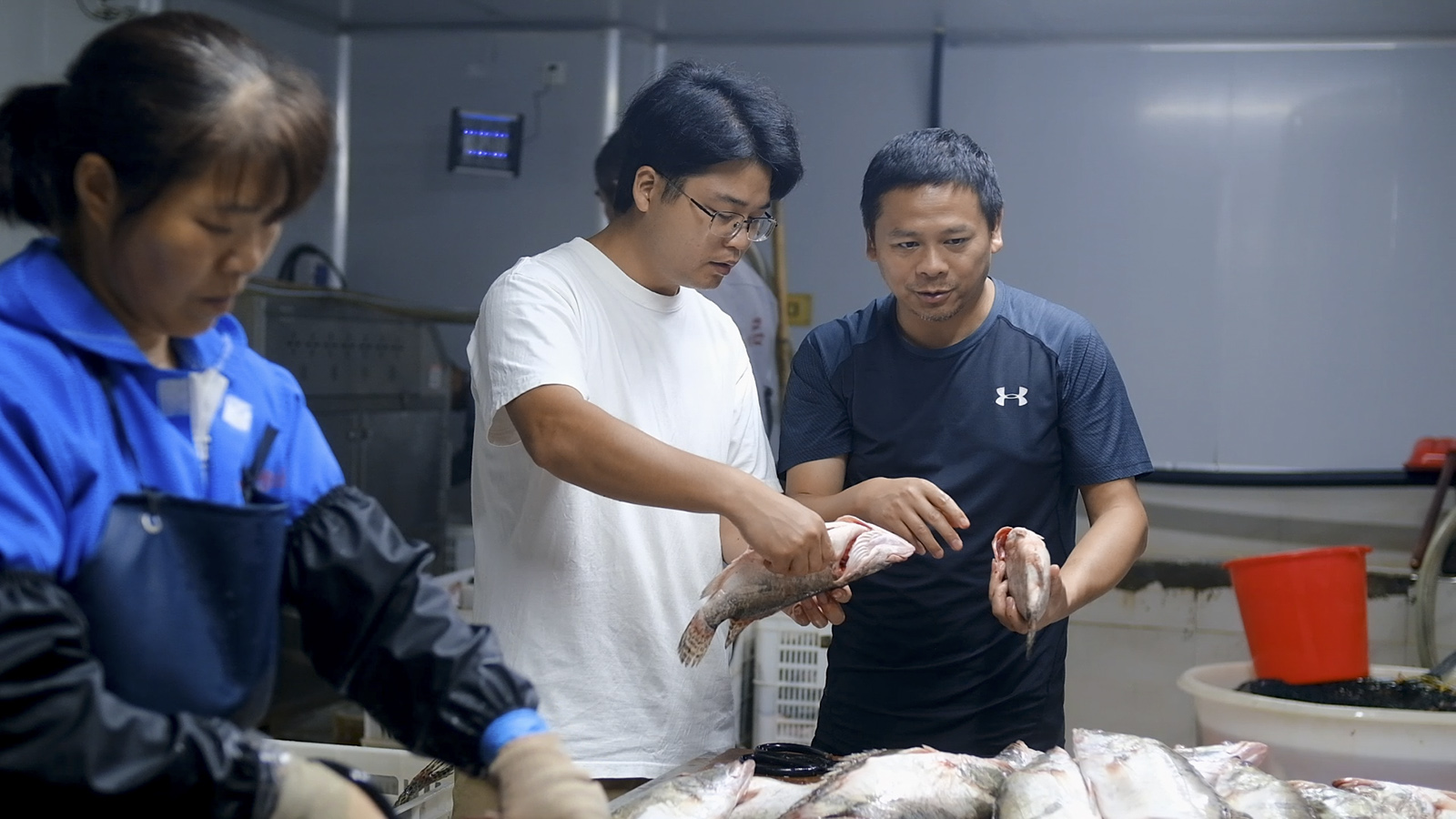 彭林(中)在和工厂厂长检查鳜鱼原材料品质