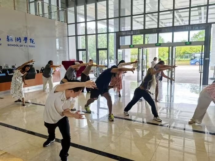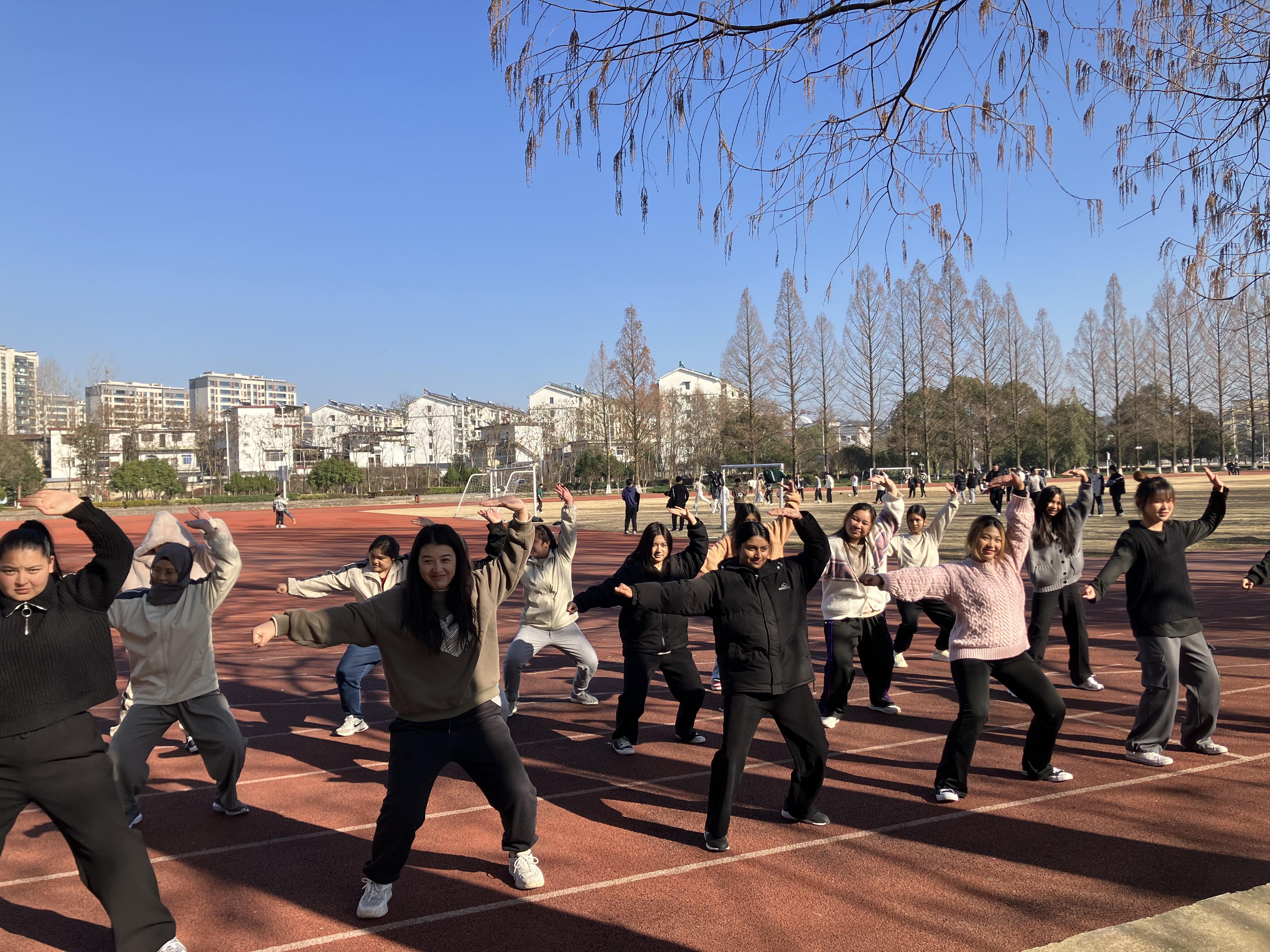 依托安徽省国际交流合作基地、华文教育基地等平台,学校让传统体育走出国门,成为跨文化交流的“金名片”。在海外华裔大学生中国文化体验营、“徽山·徽水·徽文化”安徽省外国留学生文化修学活动、美国马里兰州巴尔的摩高中生研学团等活动中,师生开展舞龙舞狮、五禽戏、太极拳、功夫扇等项目的教学与展演,让外国学子深深着迷。一名来自美国马里兰州的高中生在尝试舞龙后兴奋地说:“我原以为这只是一项表演,但握住龙杆的那一刻,我感受到了团队的力量和欢乐。”