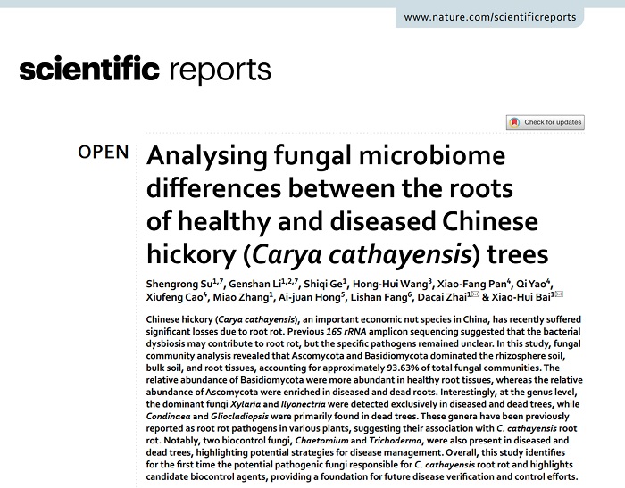 近日,我校生命与环境科学学院特色林产业发展研究中心科研平台柏晓辉教授团队在国际知名学术期刊《Scientific Reports》(SCI一区)发表研究成果,首次明确了导致歙县山核桃根腐病的潜在致病真菌,同时发现了具有应用前景的生防菌剂,为这一困扰产区多年的病害治理提供了关键科学依据,有望大幅降低歙县山核桃产业经济损失。