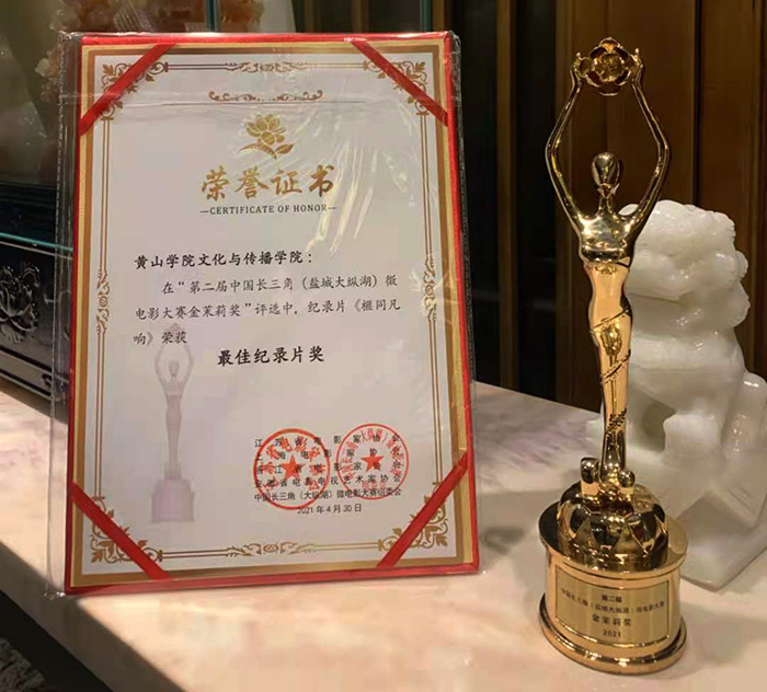 4月30日,第二届中国长三角微电影节“金茉莉奖”颁奖典礼在江苏省盐城市大纵湖东晋水城举行。文化与传播学院18级广播电视编导专业方洁、赵金龙、胡朝猛等同学创作报送的作品《榧同凡响》荣获第二届中国长三角微电影大赛“金茉莉奖”最佳纪录片奖。