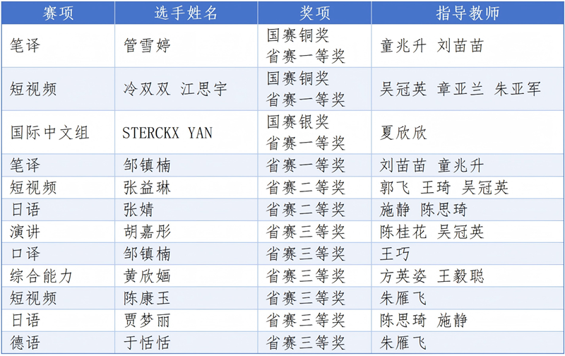 我校高度重视本届赛事,积极组织学生参与英语组笔译、短视频、综合能力、演讲、口译,多语种组日语、德语,以及国际中文组等多项比赛。在指导教师的悉心带领下,参赛学生历经数月系统备赛,不断锤炼语言应用能力、拓展跨文化视野、增强思辨与创新水平,最终在激烈竞争中脱颖而出,展现出扎实的专业基础和良好的精神风貌。