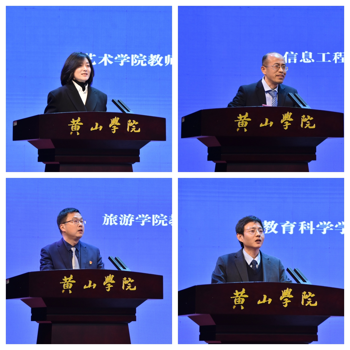 教学工作先进个人代表刘元元、科研工作先进个人代表陈珍海、党建工作先进个人代表代华、科研工作先进集体代表汪海彬在大会上进行了发言。他们分享了在教学科研、党建工作中的实践经验与心得体会,表示将以更高标准要求自己,为学校申硕目标贡献更大力量。