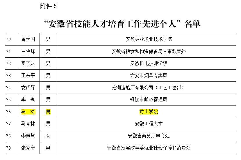 近日,安徽省人力资源和社会保障厅印发《关于表彰第十五届全省高技能人才的决定》,授予我校艺术学院工艺美术教研室“安徽省技能人才培育工作先进单位”称号,生命与环境科学学院马涛同志“安徽省技能人才培育工作先进个人”称号,生命与环境科学学院赵昌恒同志“江淮杰出工匠”称号。