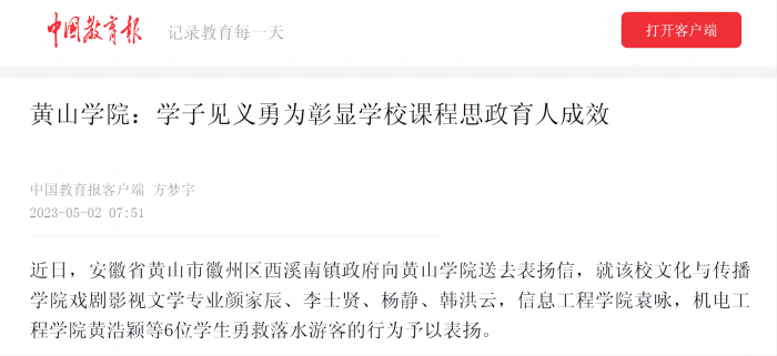 该院全面落实立德树人根本任务,“三全育人”成效显著。2023年5月2日,《中国教育报》客户端以《黄山学院:学子见义勇为彰显学校课程思政育人成效》为题,报道了信息工程学院学子袁咏见义勇为的先进事迹。