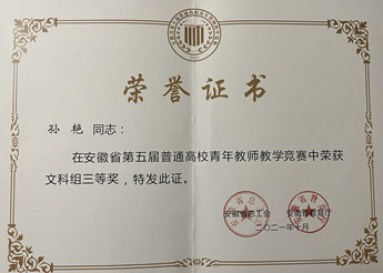 以吴文浩、胡永政和汪艳教授领衔打造的3个教学团队获批省级教学(创新)团队、2名教师获得安徽省教学名师荣誉、6名青年教师获得省级教坛新秀称号。