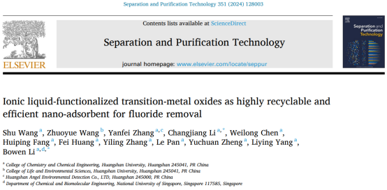 我校王澍老师和李长江老师与新加坡国立大学研究员、我校优秀校友李博文博士合作,在工程技术领域权威Top期刊《Separation and Purification Technology》(中科院1区,IF=8.6)发表了题为“Ionic liquid-functionalized transition-metal oxides as highly recyclable and efffcient nano-adsorbent for ffuoride removal”的科研论文。