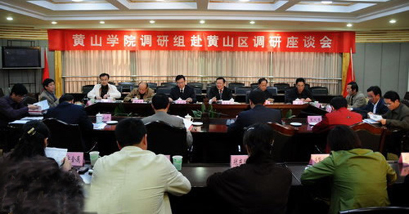 调研期间,调研组召开调研座谈会,座谈会上,黄山区党政领导,区委办、发改委、经委、农委、人事局、教育局、林业局等政府部门领导,有关企事业单位负责人,对我校在办学定位、专业设置、课程体系建设、实践教学、学生就业指导以及如何做好“产学研”合作等提出建议。黄山区委书记叶正军在座谈会上代表区委、区政府对我校调研组一行赴黄山区考察调研表示热烈欢迎,并向调研组介绍了区情、历史发展及经济社会发展规划、产业规划等情况,感谢我校多年来为黄山区培养了大量领导型、学识型、实用型的优秀人才,为黄山区的经济和社会发展做出了重要贡献。同时希望我校作为黄山市唯一的最高学府,今后能进一步加强与黄山区的合作交流,为黄山区又好又快发展提供更多的智力支持和技术指导。