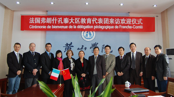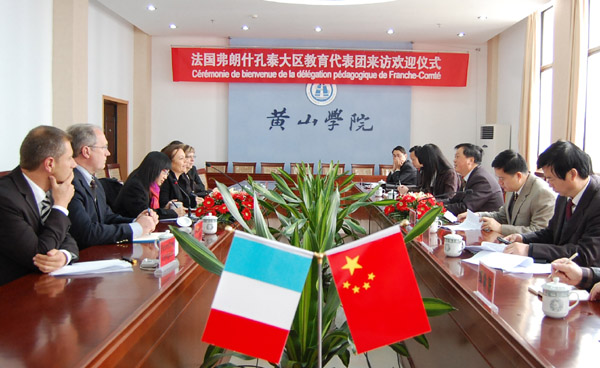 经过考察和商谈,我校与佛朗什孔泰大区教育代表团就开展交流合作事宜达成了以下共识:黄山学院将会在佛朗什孔泰大区和黄山市友好合作的大框架内积极推动教育机构之间的友好交流与合作;黄山学院将按照先易后难、先语言后专业的步骤来逐一落实从今年开始的派出3名教师和2名学生的项目。同时,欢迎来自佛朗什孔泰大区的老师和学生来我校进行学习和实习。黄山学院希望加强双方教育机构,特别是与佛朗什孔泰大学之间的联系,推进双方在教育交流领域广泛和深入的合作。