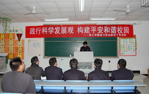 黄山市交警支队直属二大队领导在培训班上为学员详细讲解了交通安全各项常识,结合我校自身的特点,为我校日常校园交通管理提出了指导意见。会议结束后,交警支队的同志现场对我校保卫人员进行了交通指挥技能培训。