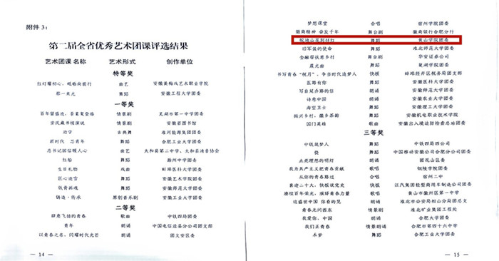 近日,由共青团安徽省委主办的第二届全省优秀艺术团课评选活动结果公布。我校教育科学学院选送、王璐老师指导的舞蹈作品《皖地山花别样红》荣获安徽省第二届优秀艺术团课二等奖。