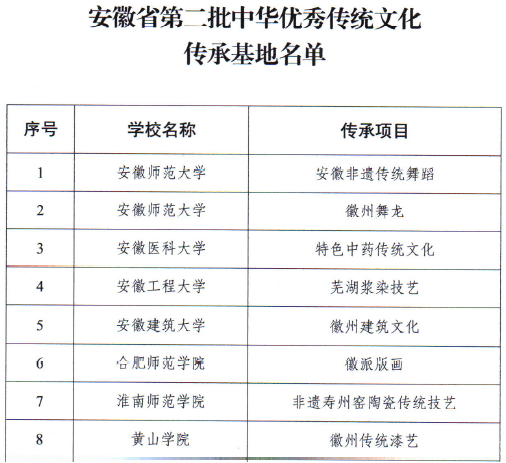 6月15日,安徽省教育厅印发《关于公布安徽省第二批中华优秀传统文化传承基地名单的通知》,我校艺术学院申报的“徽州传统漆艺”获批中华优秀传统文化传承基地。