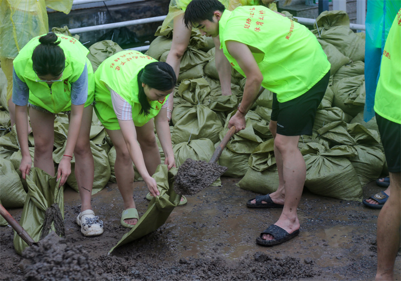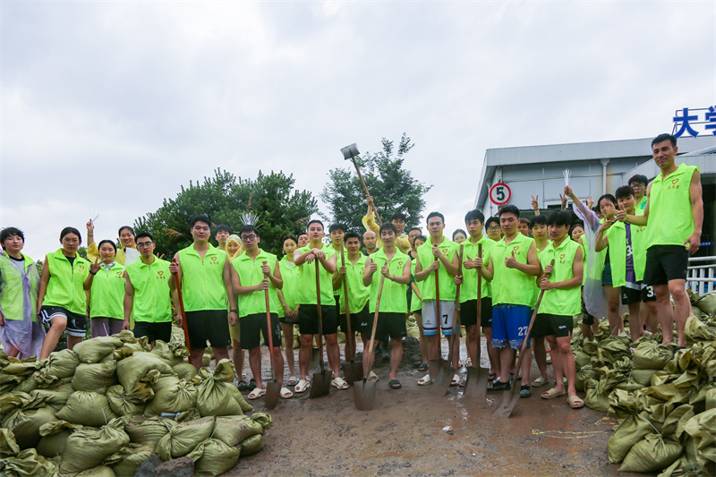 汛情就是命令,下午2点,接到任务通知后,体育学院教师带领学生党员迅速投入战斗,大家精神饱满、斗志昂扬,发挥模范带头作用,不怕苦、不怕累,无论男女,都身穿雨衣,冒着大雨,铲沙、装袋、扎口、搬运,团结协作,各有分工。经过近3个小时的奋战,将近30吨沙子被装成1200多个沙袋,为学校防汛工作打下坚实的基础。雨水打湿了他们的衣服,泥巴沾满了他们的鞋子,有的学生手弄伤了、磨破了,但没有丝毫怨言,面对堆起来的一袋袋沙袋,他们的脸上都露出了开心的微笑,他们都为守护学校平安尽一份力量而由衷地高兴。