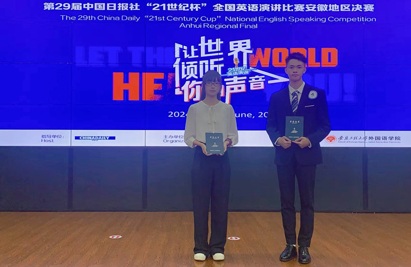 6月22日,第29届中国日报社“21世纪杯”全国英语演讲比赛安徽地区决赛在安徽工程大学举行,来自安徽大学、合肥工业大学、安徽师范大学等省内10多所高校的同学参加决赛。在外国语学院学院方莉和王巧两位老师指导下,我校旅游学院戴悦、外国语学院张思飞两位同学在决赛中凭借出色表现,分获二等奖、三等奖。