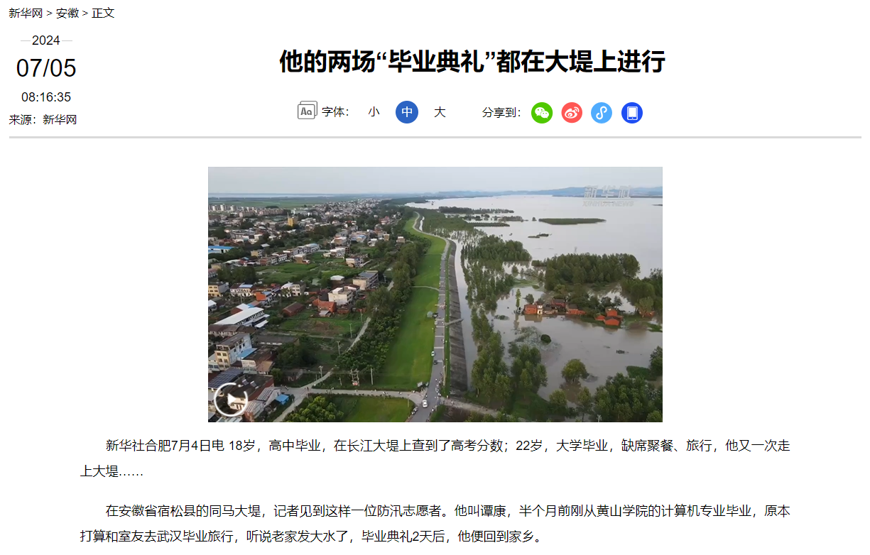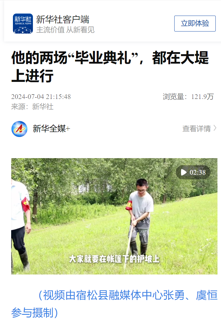 1、新华网:他的两场“毕业典礼”都在大堤上进行http://www.ah.news.cn/20240705/43681ff7c6d944519b033d43ae5369f7/c.html