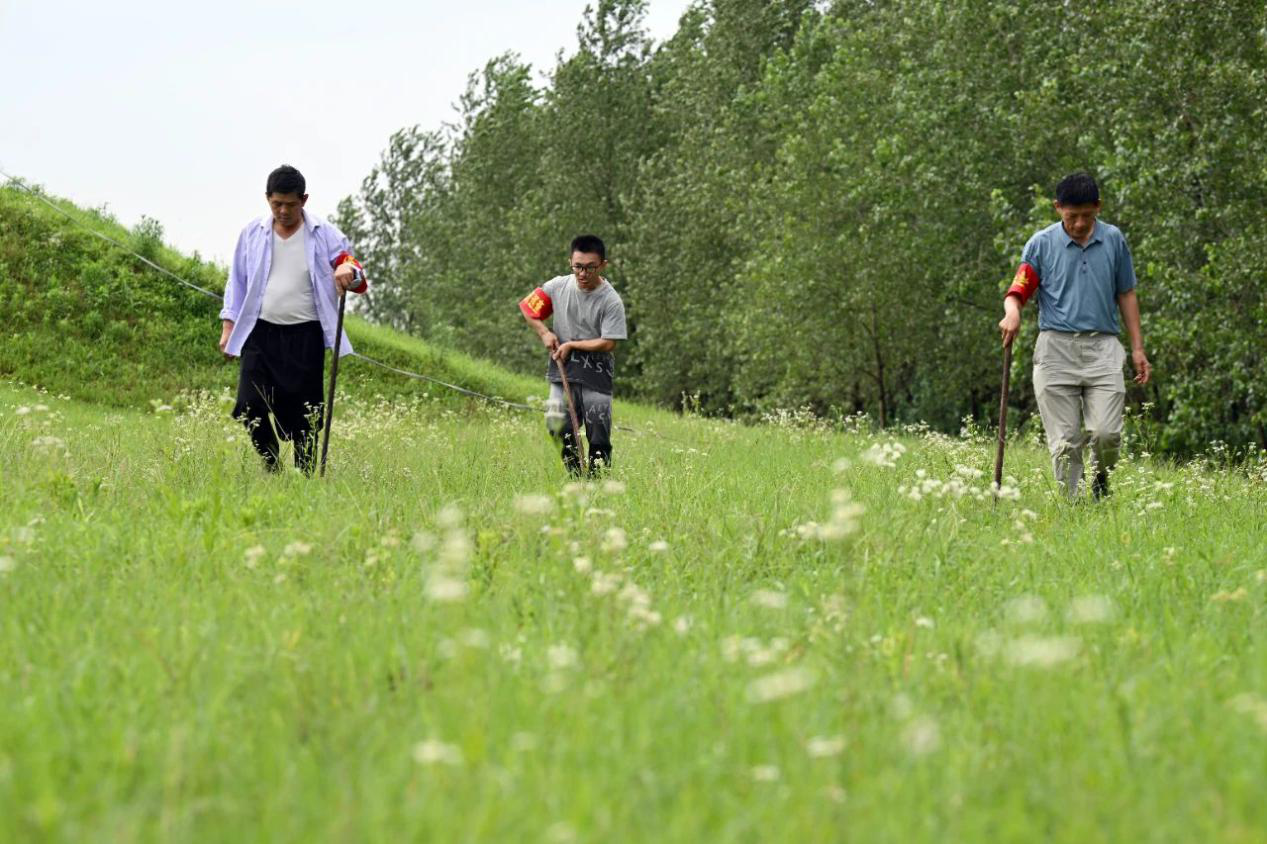 身材瘦小的谭康,穿着有些肥大的胶靴,与大伙儿并排走在帐篷下的护坡,用铁锹翻开没到小腿的杂草,查看有无管涌、渗漏。像这样的巡逻,每3个小时一次,虽然只有一公里,但看得细,来回一趟得四十分钟。