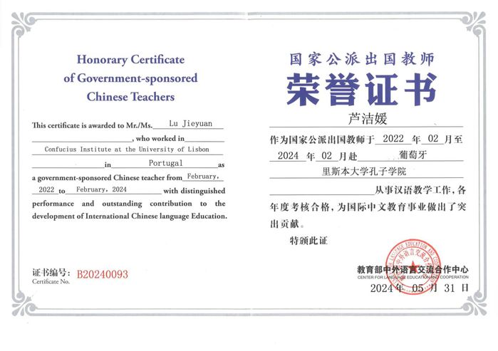 2022年,芦洁媛老师通过国家公派出国教师项目,前往葡萄牙里斯本大学孔子学院开展为期两年的汉语教学工作。任教期间,芦洁媛老师严谨的教学态度和过硬的教学能力广受赞誉。她指导的学生参加第二十二届“汉语桥”比赛,取得葡萄牙全国第一名的好成绩。