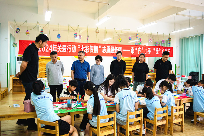 在齐云山中心小学,章文静一行看望了全国2024年关爱行动“七彩假期”志愿服务团的师生,详细了解志愿者们的生活和工作情况。章文静现场观摩了音乐、体育、美术课程教学,高度肯定志愿者们的工作热情和服务成效。